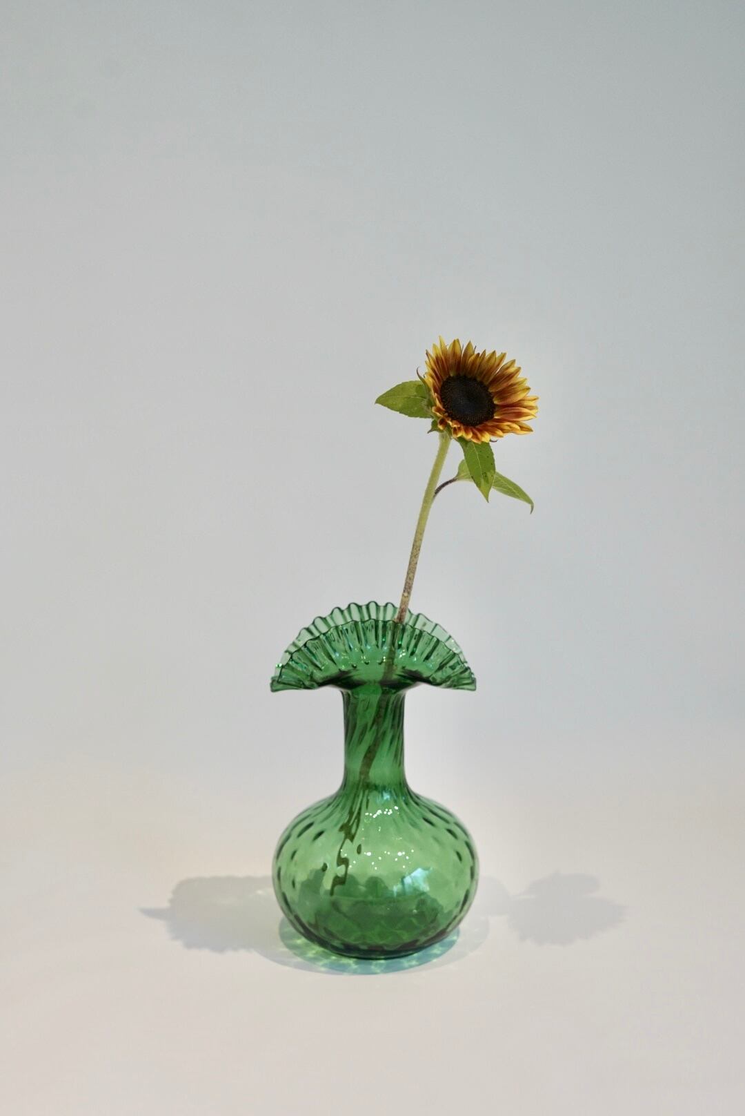 全体的に、波打ったような加工がされており、水を入れた時や光りに当たった時、一層美しく見えます。個性的な鮮やかな緑色が空間のアクセントに。