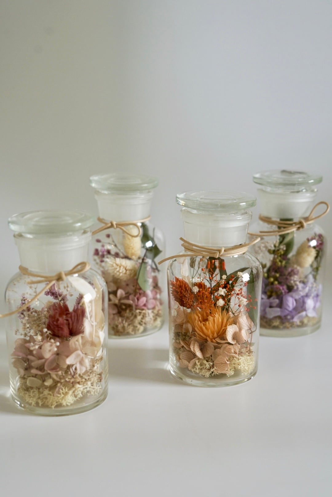 ドライフラワーを詰め込んだガラスボトル。