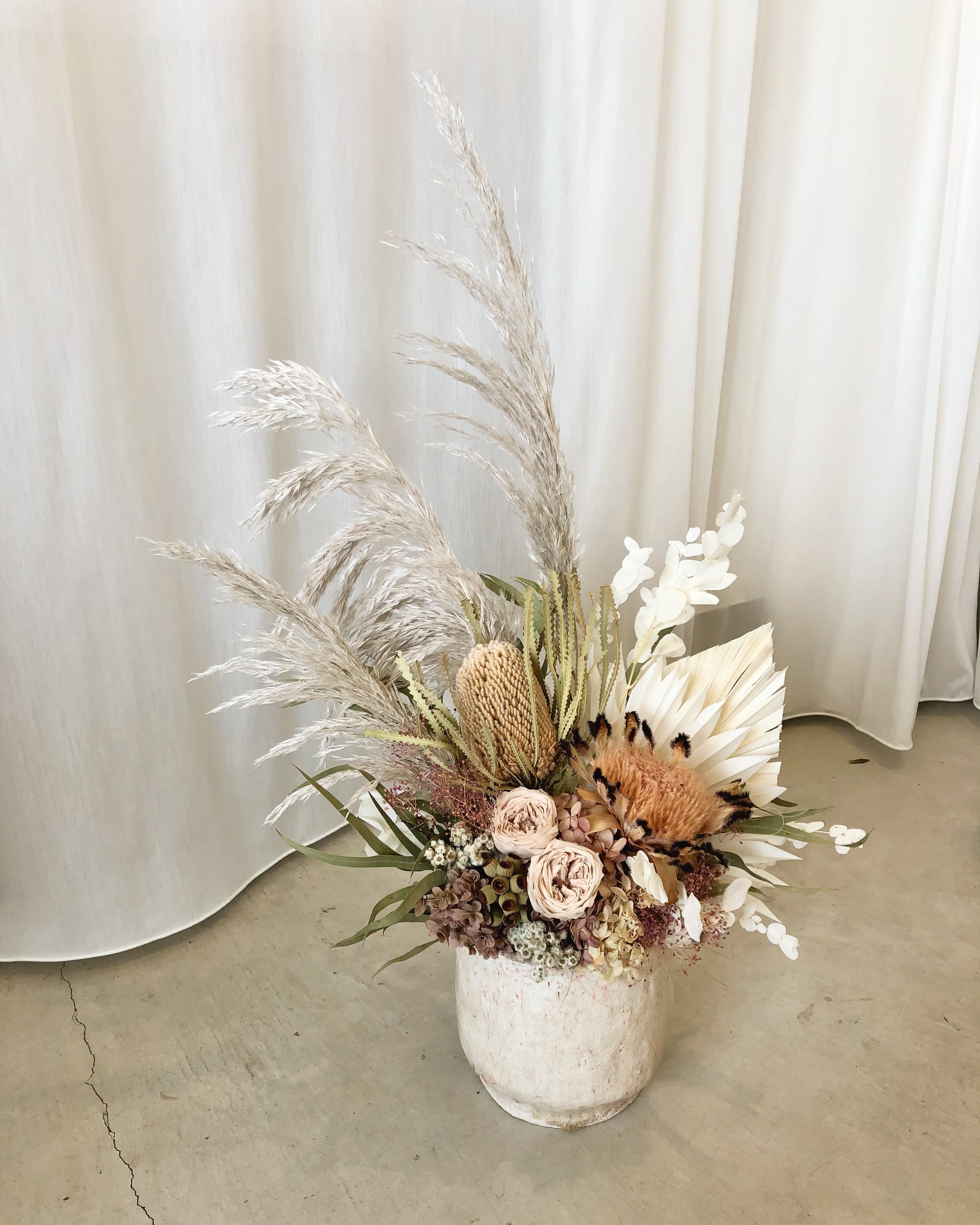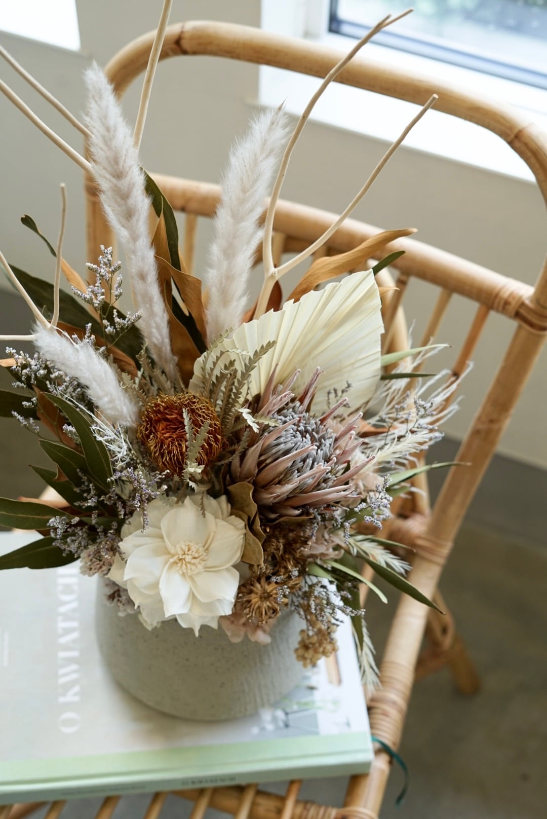 ドライフラワーやプリザーブドフラワーを使用した、陶器に入ったアレンジメントです。